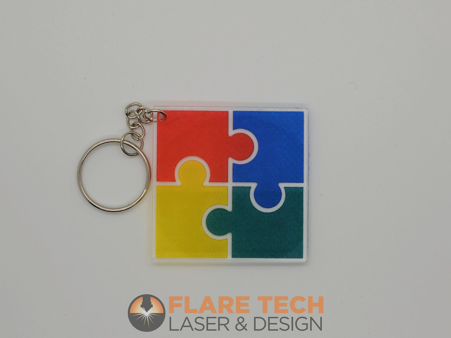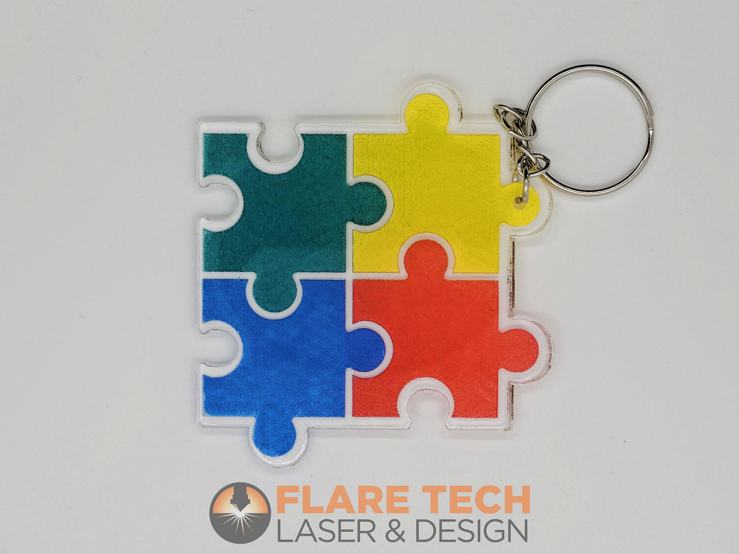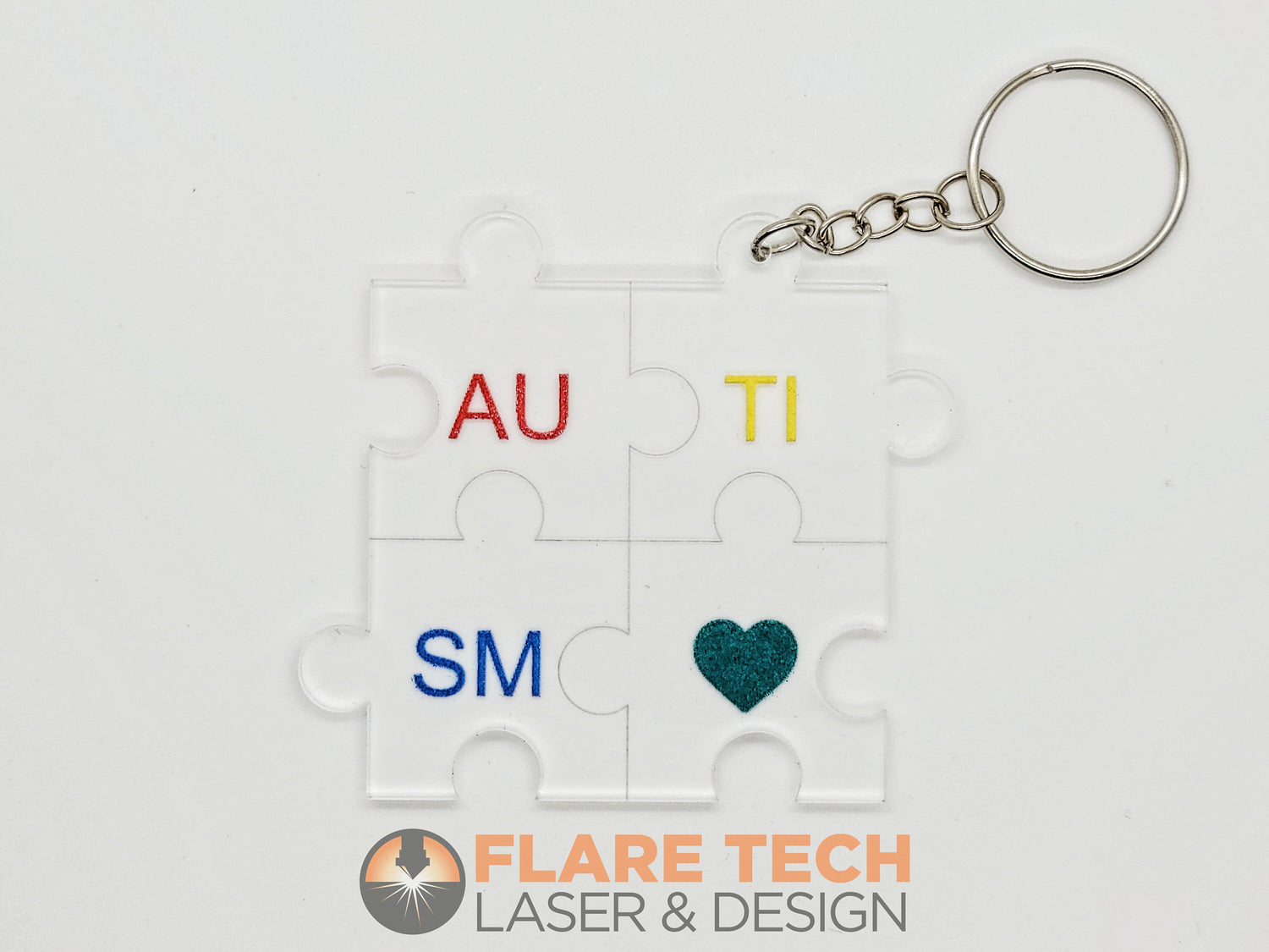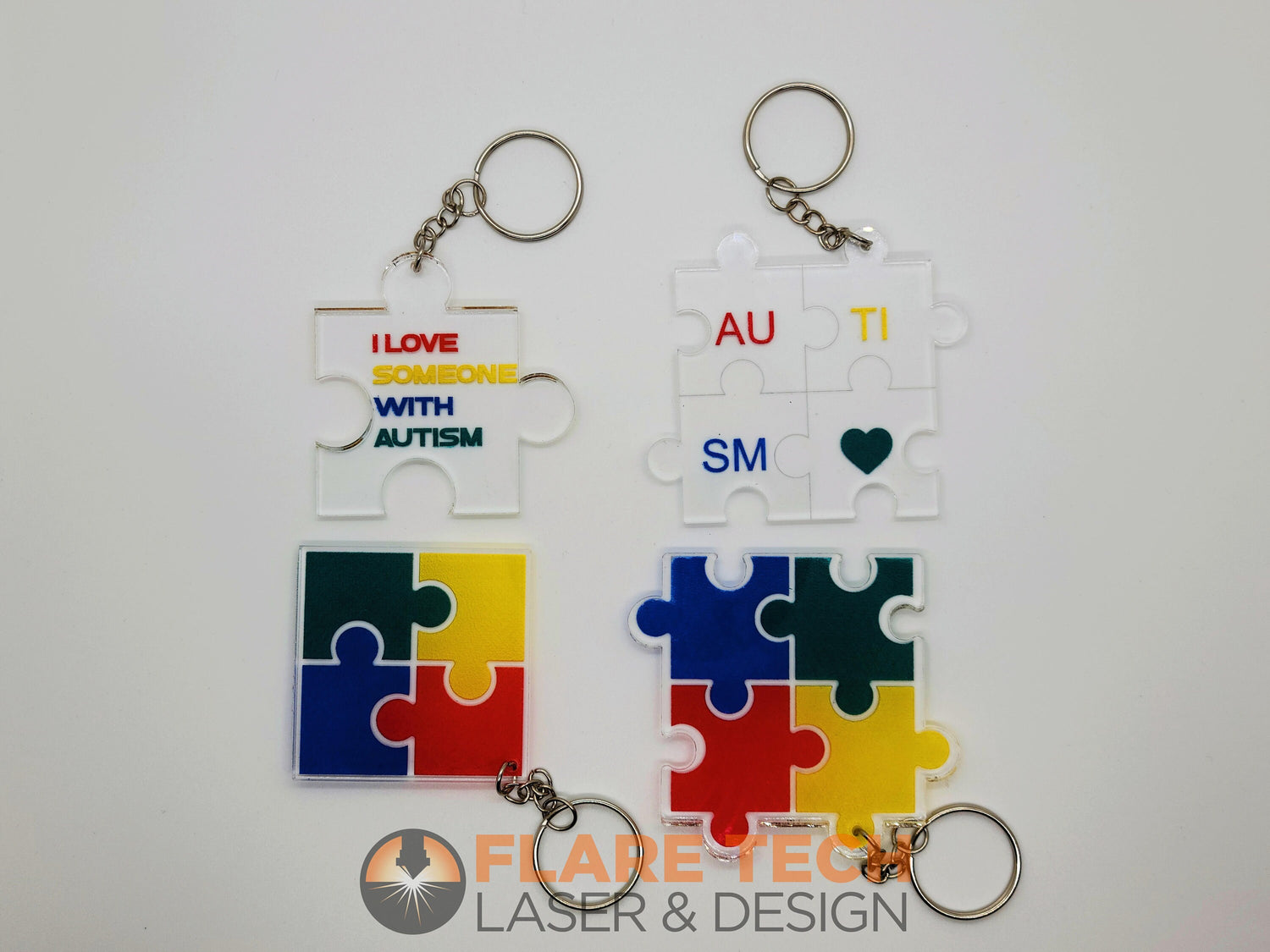 Stylish keychains for Autism Awareness. These keychains are engraved on 1/8" clear acrylic with Red, Yellow, Blue, and Green painted into the various words and puzzle pieces (see images). Perfect to hang from a key ring, backpack, purse, wallet, lanyard, and more! Made from High-Quality Materials for Laser Engraving.