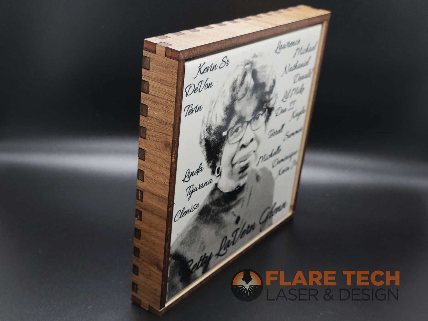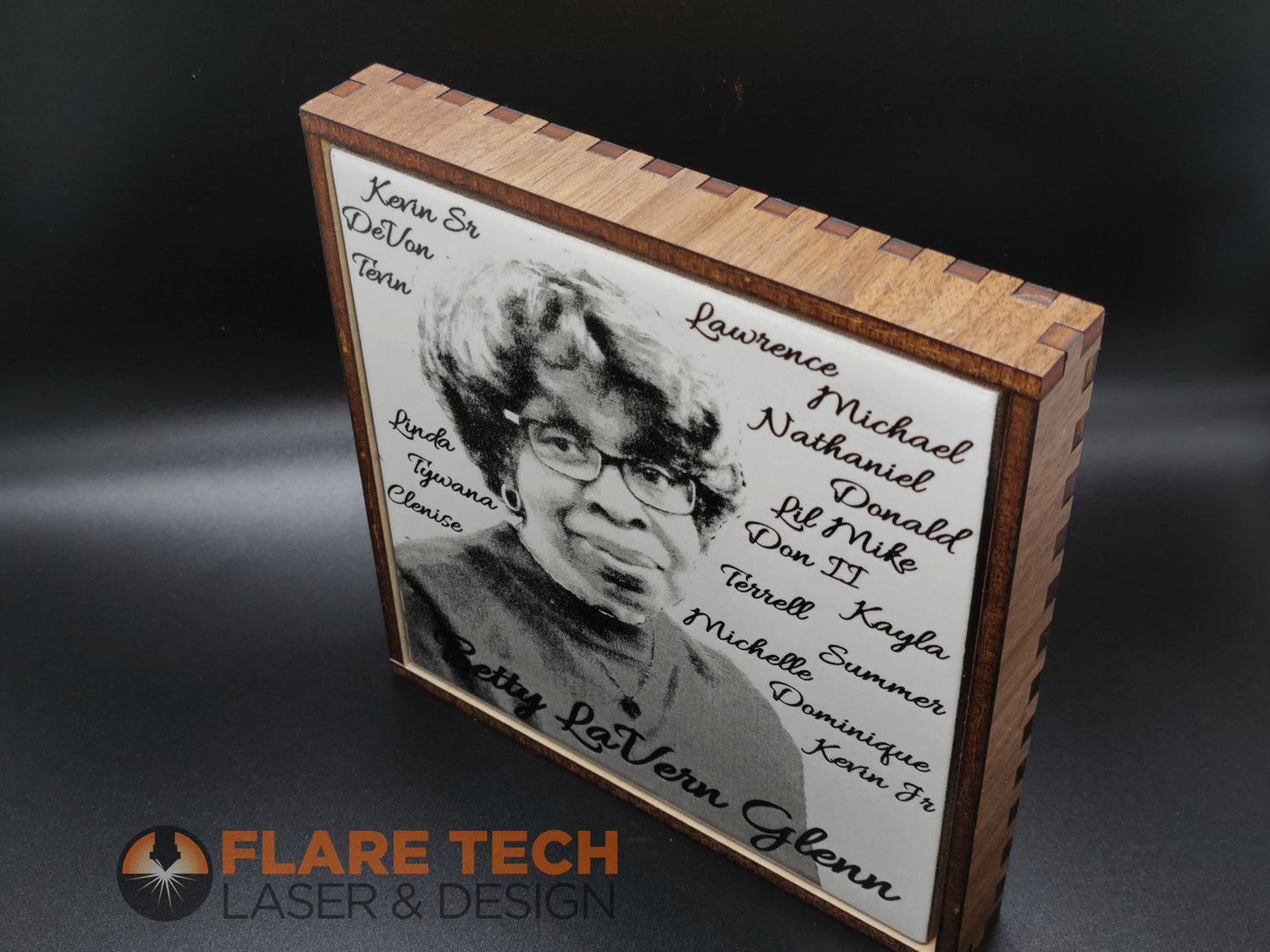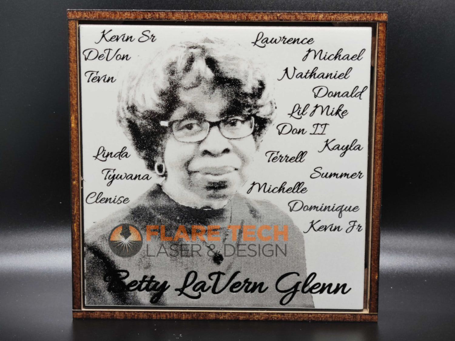 Our custom engraved photos are made using 1/4 inch ceramic tile that is painted black and engraved with a Glowforge laser cutter. After the tile is cut, it is sealed using a long-lasting glaze for longevity, making it excellent for engraving photos on. Photos are engraved edge to edge.